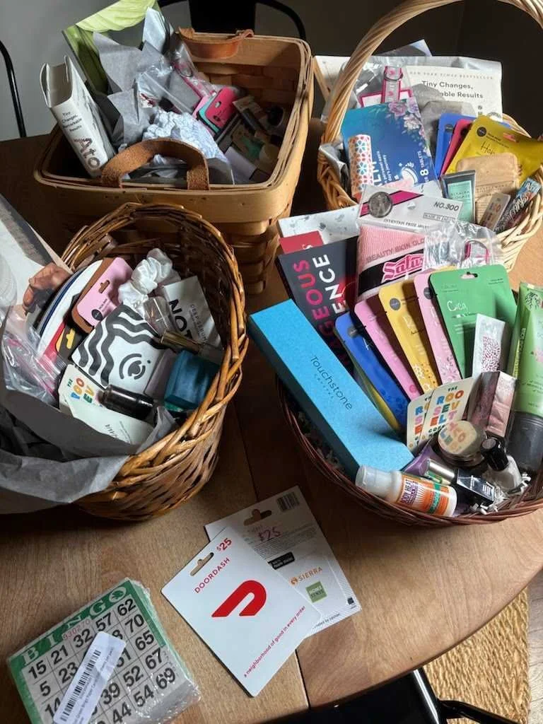 Human trafficking survivors in advanced recovery (thrivers) gather several times a year just for the fun of it! The group enjoys building healthy community. Together they enjoyed a game night (prize baskets pictured below), manicures, and going to the movies.